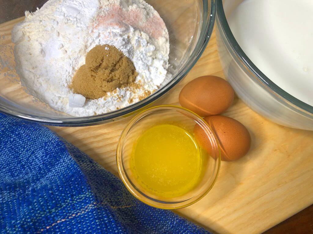 Measure + combine dry ingredients in one bowl. Measure + combine wet ingredients in another bowl. Pour the wet into the dry. Stir and pour in the pan. Bake 9-10 minutes, slice and serve!